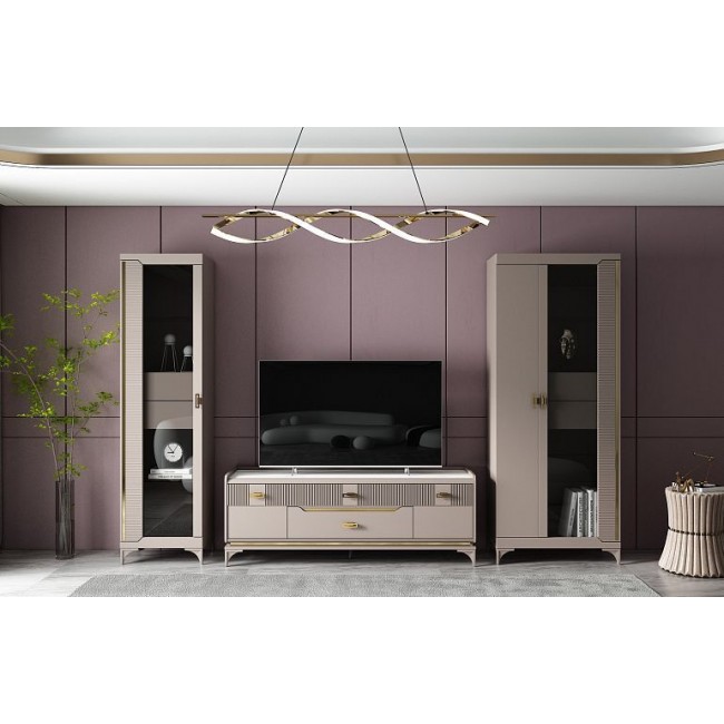 Универсальный серо-бежевый цвет и вставки под золото, сделают изделие изящным завершающим штрихом гостиной.