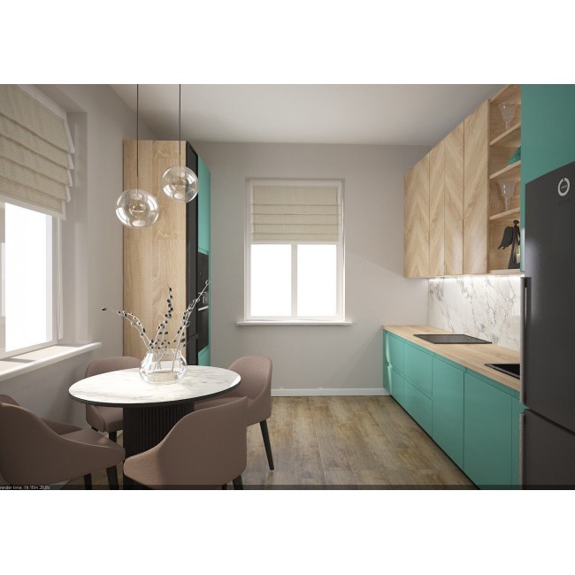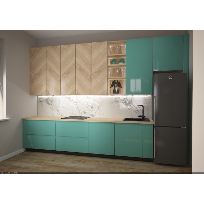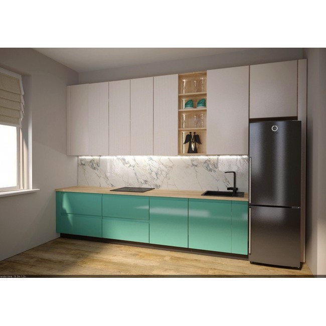 Заказная кухня сочетает верхние фасады из белого МДФ с фрезеровкой «Волна» и нижние фасады из глянцевого лазурного МДФ, формируя выразительный, но гармоничный контраст оттенков. Ящики оснащены аккуратными углублениями в фасадах, обеспечивающими бесшовное открытие и подчёркивающими минималистичные линии дизайна.