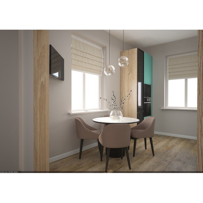 Тёплая древесная структура столешницы смягчает яркость цветовой композиции и добавляет тактильной натуральности, а чёрный плинтус визуально приподнимает гарнитур, создавая эффект парения и лёгкости в пространстве. Такая кухня — продуманное сочетание эстетики и практичности, идеальное для современного интерьера.