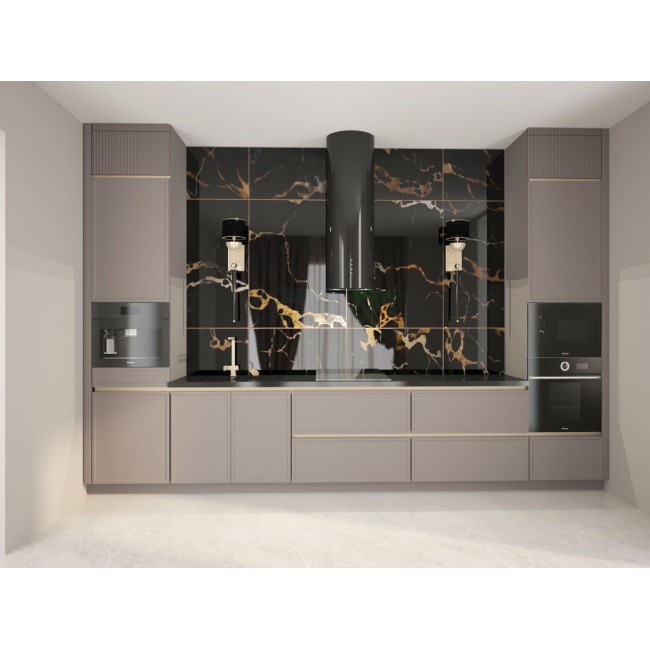 Фасады выполнены в сером матовом оттенке с лаконичной прямой фрезеровкой — чистые линии и тонкая текстура создают спокойную, архитектурную основу. Отсутствие ручек поддерживает строгий минимализм и визуальную лёгкость гарнитура.
