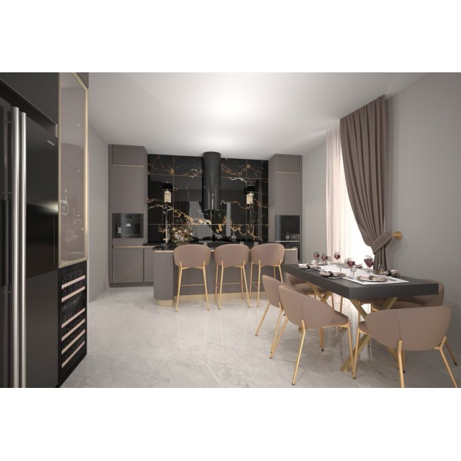 Чёрная столешница и настенная плитка усиливают контраст и придают пространству графичность, золотистые элементы на гарнитуре и золотые опоры стола и стульев вносят тонкий акцент роскоши.