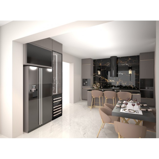 Элегантная кухня, изготовленная на заказ, объединяет в своём дизайне сдержанную минималистичную эстетику и благородные акценты.