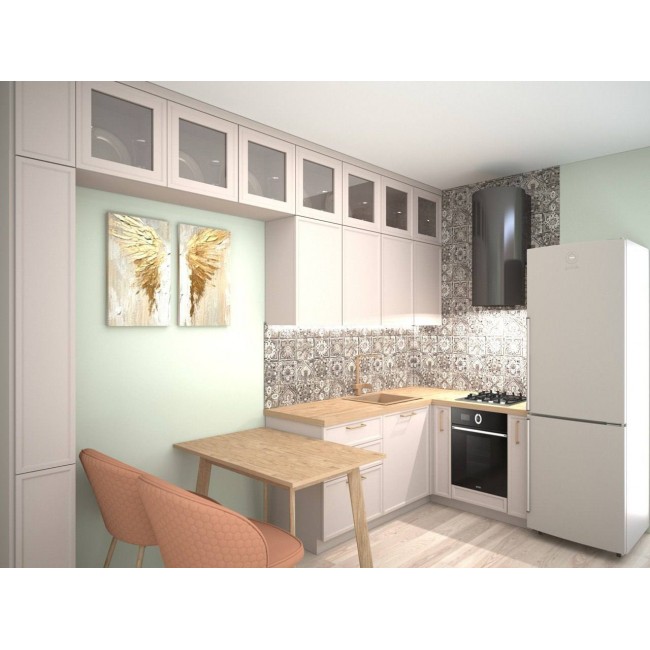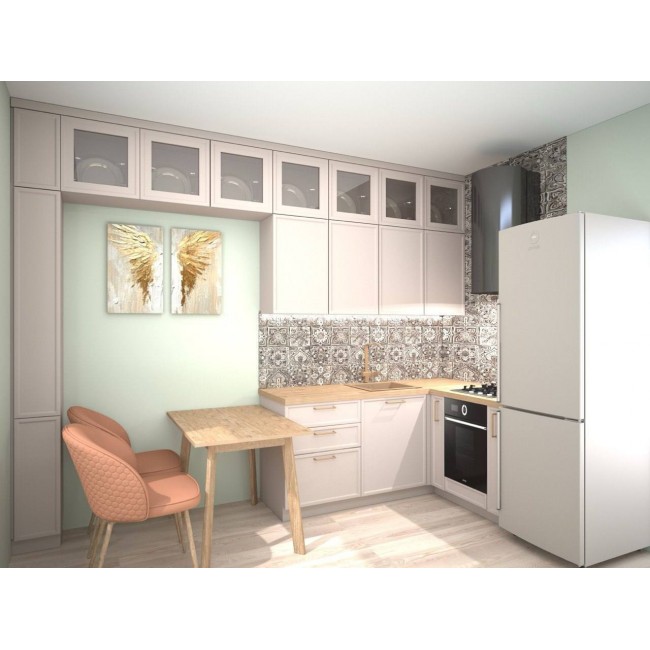 В проекте кухни предусмотрена система навесных шкафов и пеналов с матовыми фасадами с фрезеровкой, что позволяет максимально практично использовать небольшое пространство.