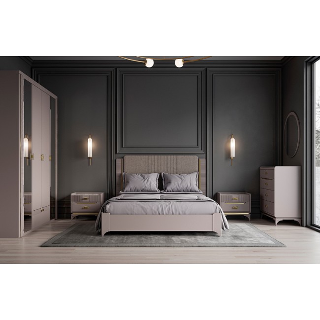 В данном комплекте представлены 4-х дверный шкаф, кровать спальное место 1600*2000, две прикроватные тумбы, комод малый и зеркало к нему.