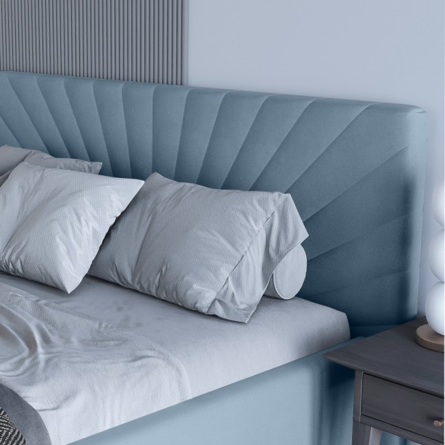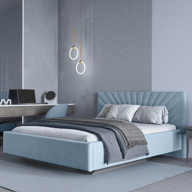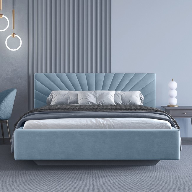Достоинства данной кровати - актуальный дизайн спинки в форме исходящих лучей. Парящая кровать один из более оригинальных элементов мебельного дизайна.