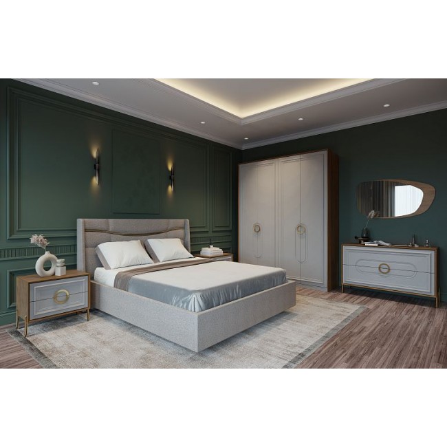 Изюминка спальни – роскошная кровать с мягким изголовьем и царгами подарят непередаваемые тактильные ощущения. Кровать можно выбрать как для одного человека, так и для двоих, а четырехдверный шкаф и два варианта комодов отвечают всем требованиям эргономики.
