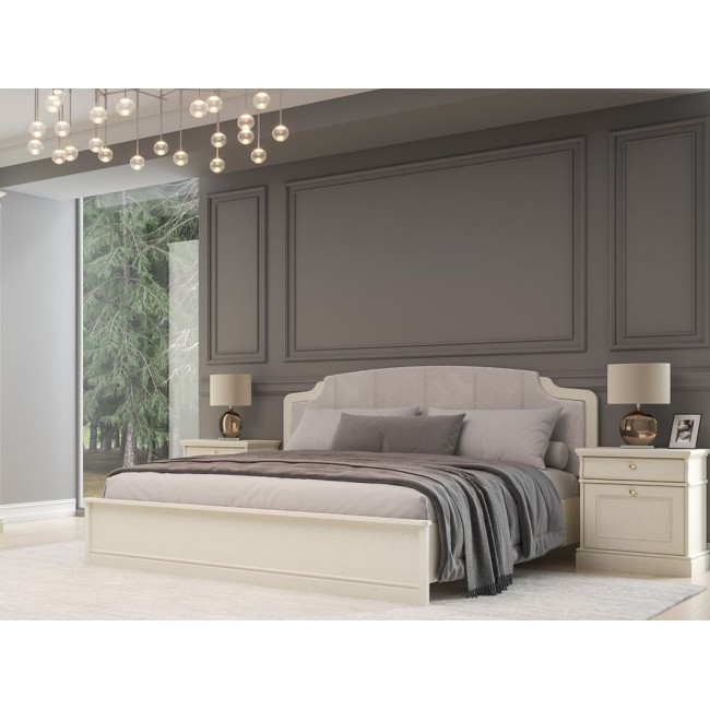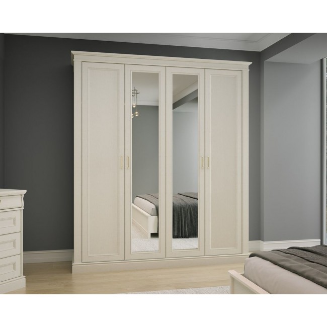 В данном комплекте представлены 4-х дверный шкаф, кровать Люкс, две прикроватные тумбы, комод и зеркало к нему.